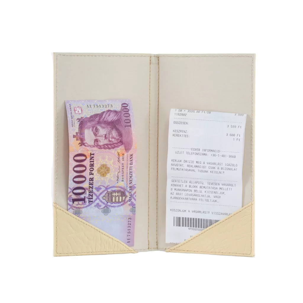 Halványsárga, erezetes felületű, bőrhatású számlatartó, csáró, varrott, 2 füllel